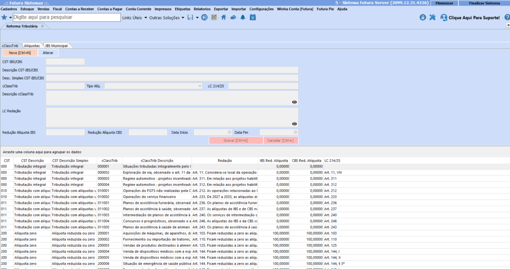 Caminho: Cadastro > Fiscal > Reforma Tributária