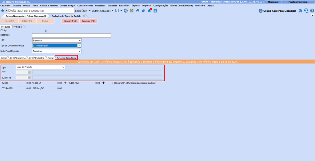 Na tela do tipo de pedido, foi incluída a aba “Reforma Tributária”, que possibilita a configuração do Tipo, CST e cClassTrib.